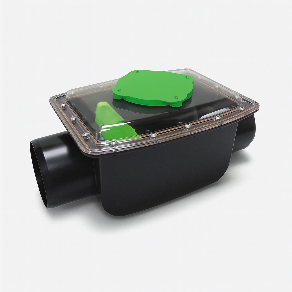 Ersätter en inspektionskammare som monteras vid avloppssystemets utlopp från byggnaden.